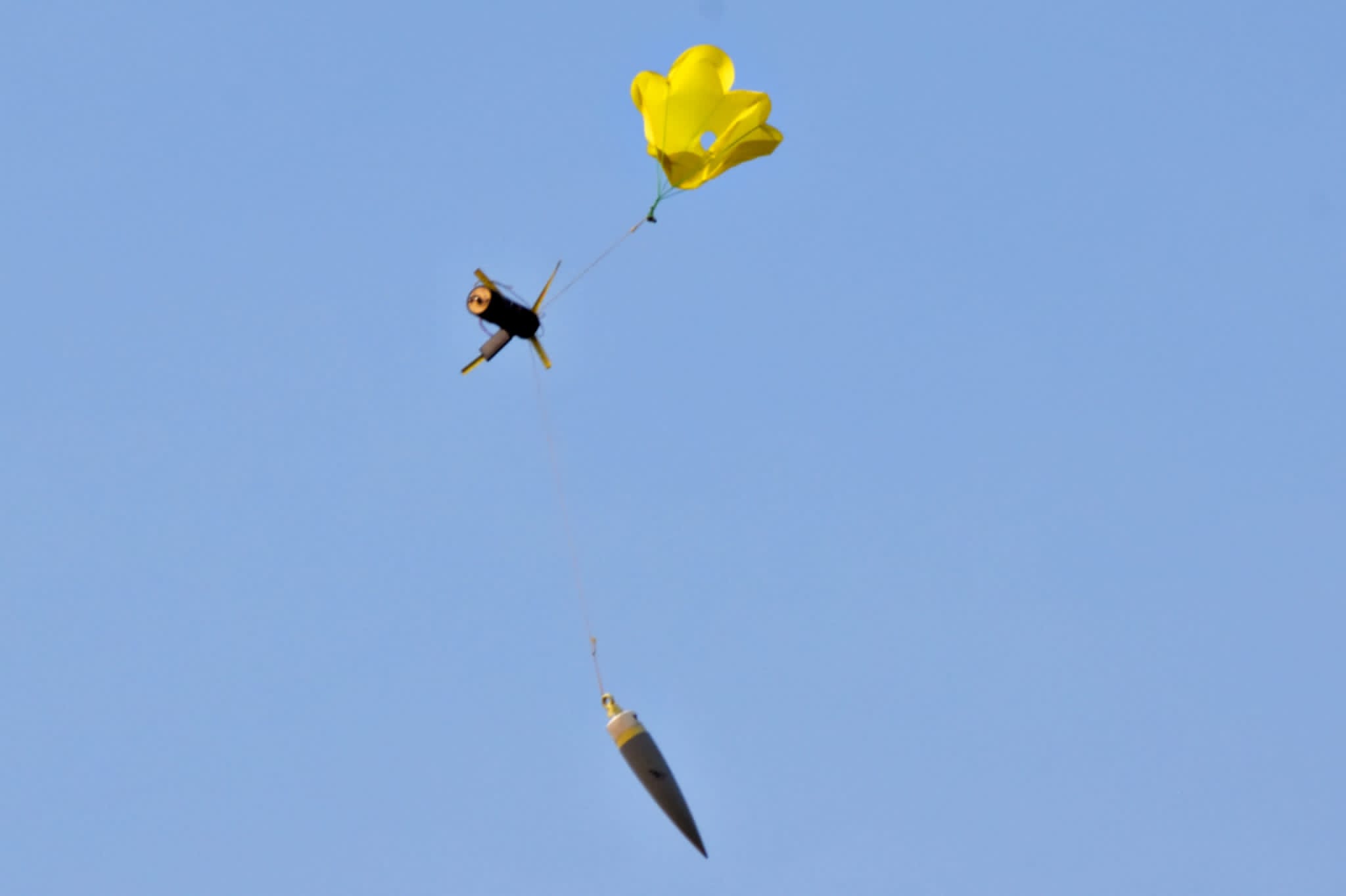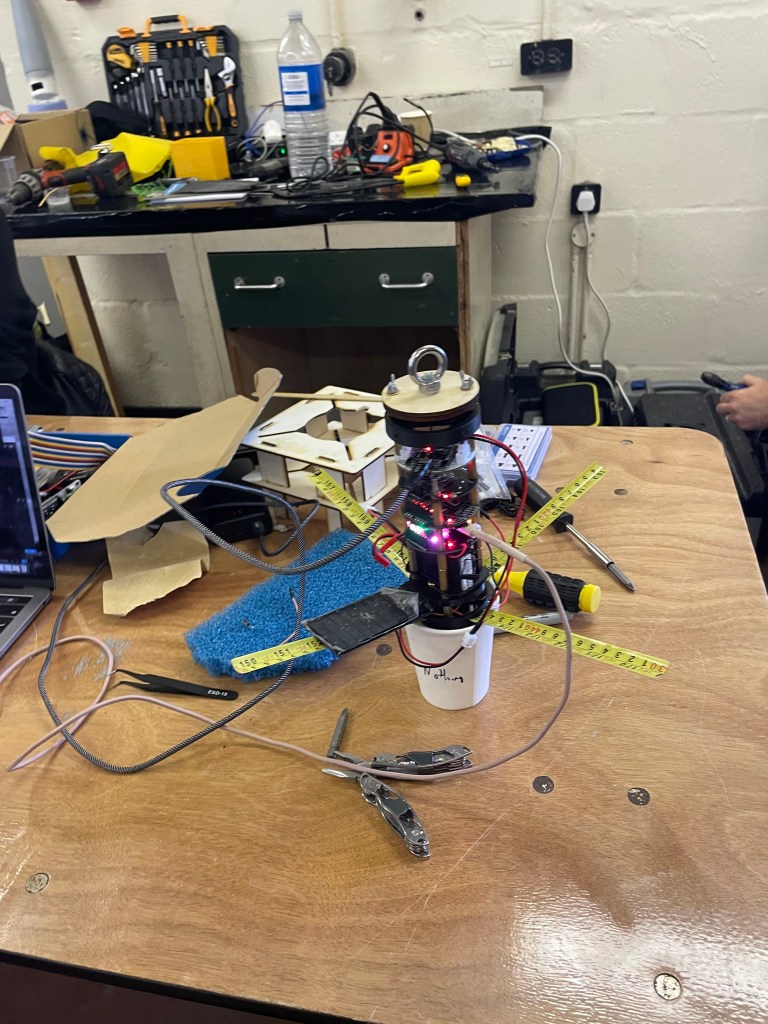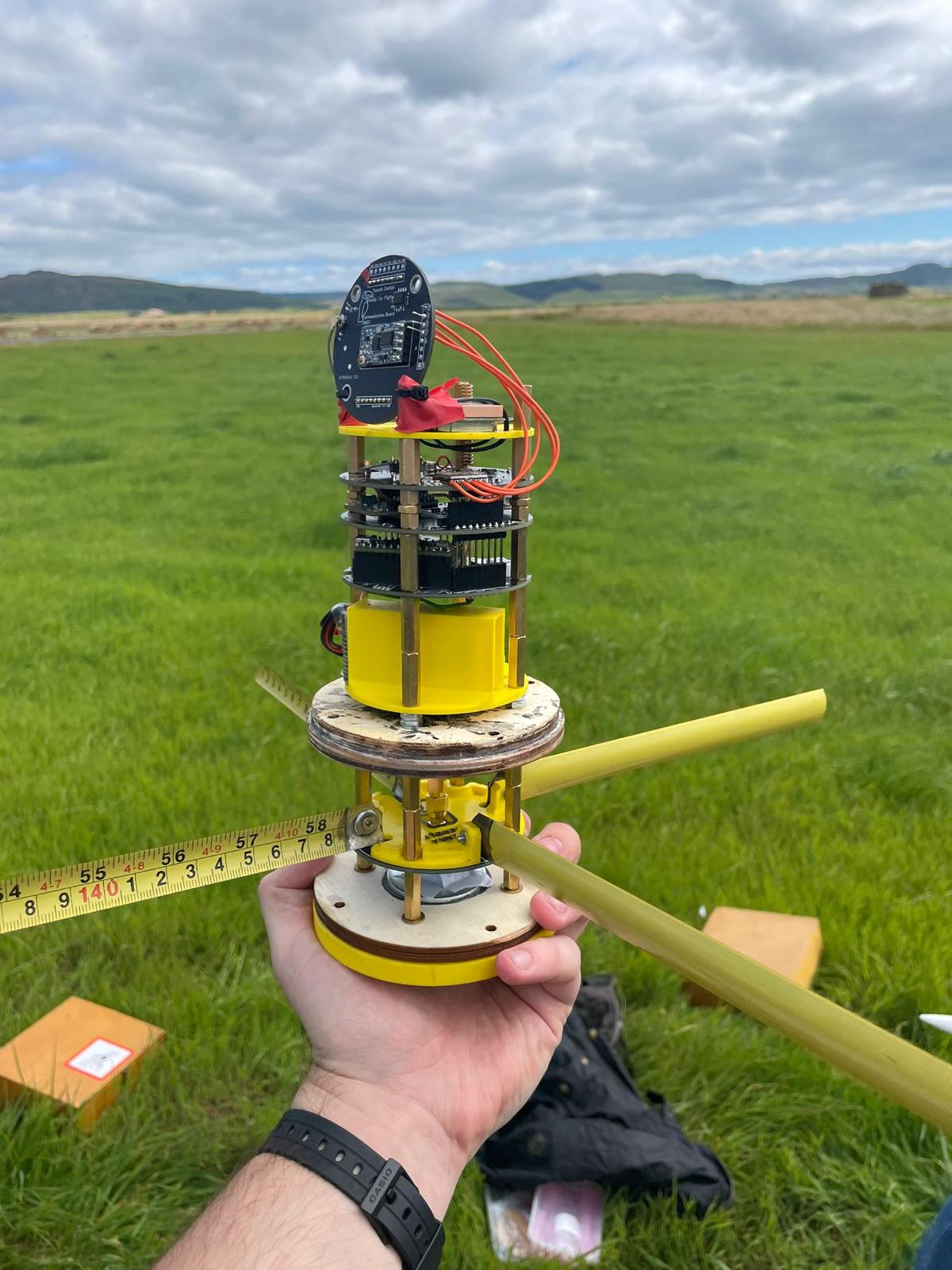 Onboard were pressure sensors and temperature sensors, to calculate its altitude, an IMU and GPS to track its location, which was transmitted from our onboard radio. The tape measures were functional deployable antennas used for the radio.